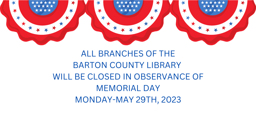 closed-for-memorial-day Closed for Memorial Day https://www.bclib.info/site-assets/images/closed-for-memorial-day/view https://www.bclib.info/site-assets/images/closed-for-memorial-day/@@images/image-1200-453bdd0dc84b3f6741a2bc1d4bd72892.png Closed for Memorial Day ALL BRANCHES OF THE BARTON COUNTY LIBRRY WILL BE CLOSED IN OBSERVANCE OF MEMORIAL DAY MONDAY, MAY 5TH, 2023 (1).png image/png Type image/png Dimension Dimension 980x432 Size File size 91.9 KB Download View full-size image